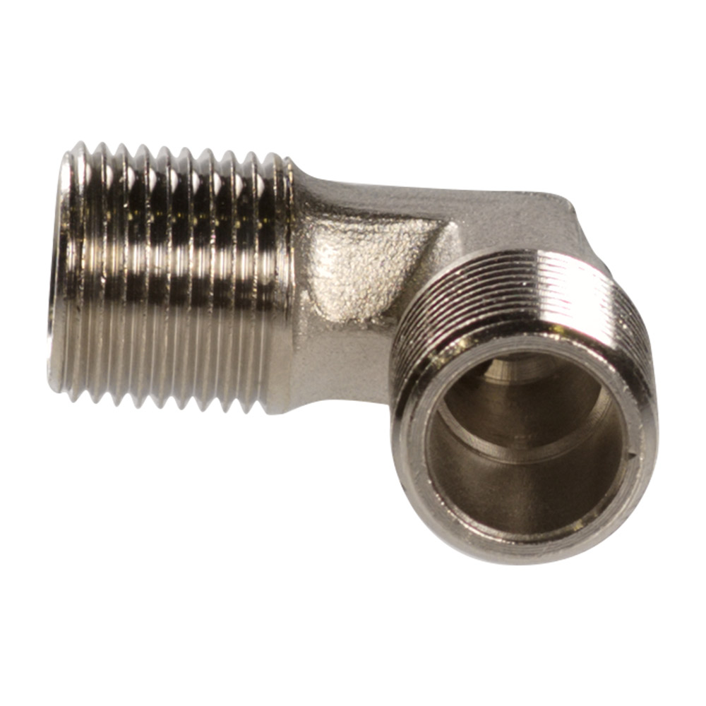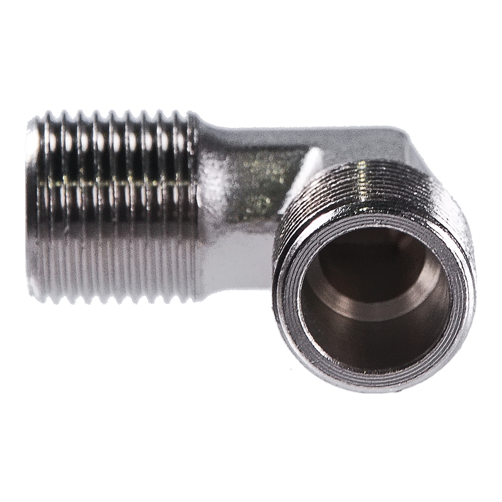 L-образный переходник (уголок) соединяет участки пневмосистемы под углом 90°. Крепление - резьба 3/8". Поставляется в блистере.