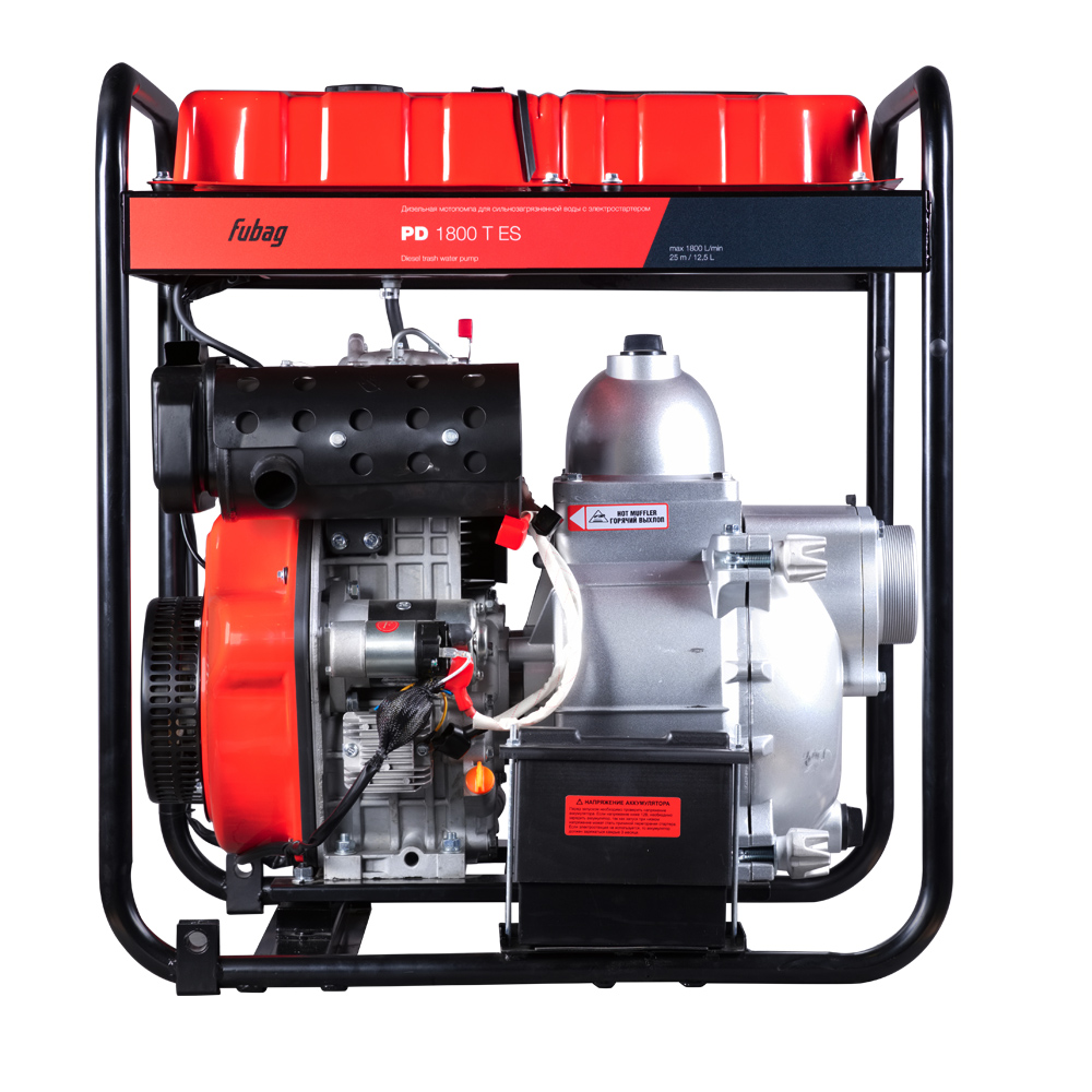 Дизельная мотопомпа FUBAG для сильнозагрязненной воды - автономно работающее устройство производительностью 1800 л/мин, перекачивающее грязную воду с абразивными включениями диаметром до 27 мм.Помпа PD 1800 T ES подходит для откачивания воды с песком и мелкими камнями. Оснащена дизельным двигателем с воздушным охлаждением мощностью 9,4 кВт, предназначенным для тяжелых условий эксплуатации. Графитовые сальники и специальная усиленная конструкция улиты насоса, изготовленной из термически обработанного чугуна, гарантируют повышенный ресурс работы. Дизельные помпы FUBAG оптимальны для работ в сельском хозяйстве, на строительных площадках, промышленных предприятиях, в коммунальном хозяйстве, при разработке карьеров, шахт, очистки загрязненных водоемов, откачки котлованов, в условиях паводка. Дизельный двигатель легко запускается с помощью электростартера.