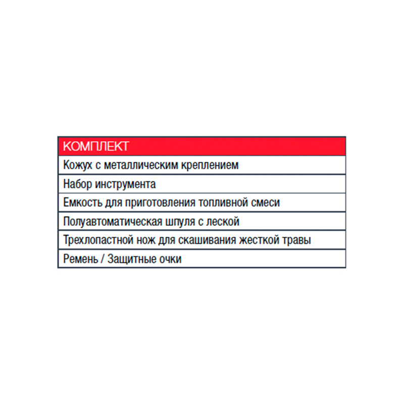 Кожух с металлическим креплением, Набор инструмента, Емкость для приготовления топливной смеси, Полуавтоматическая шпуля (облегченная заправка) с леской (посадка М10-1,25 мм) , Трехлопастной стальной нож для скашивания жесткой травы, Ремень/ защитные очки |